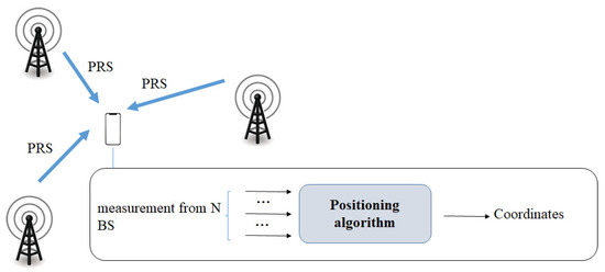 The positioning procedure is a certain asymmetric procedure as shown in Figure 2. Multiple BS would transmit positioning reference signals (PRS) to the devices. On the device side, the positioning device would derive its coordinates according to the measurement of PRS from multiple BSs based on positioning algorithms.
