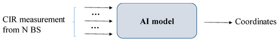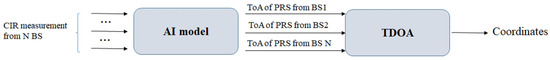 In this paper, two kinds of AI-based positioning methods are considered for evaluation. The first one is the direct AI-based positioning as shown in Figure 4, in which the output of the AI model is device’s coordinates, and the other one is the indirect AI-based positioning, in which the output of the AI model is the intermediate parameter for the positioning. For example, the output of the AI model could be the ToA, Angle of Arrival (AoA), or the LOS or NLOS identity. Then, derive the UE’s coordinates based on the inference intermediate parameter by the traditional positioning. In this paper, we will use the AI model to predict ToA. Then, using the TDOA algorithm to calculate the coordinates as shown in the principle in Figure 5. In both AI-based positioning methods, the input of the AI model is the channel impulse response (CIR) of the received positioning reference signaling from 18 BSs.