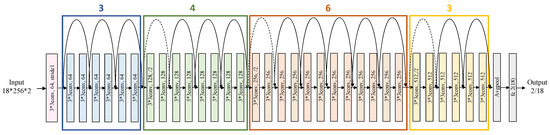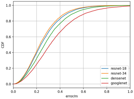 In pre-tests, we evaluated several different well-known deep learning architectures such as GoogLeNet, DenseNet, and ResNet. As shown in Figure 6, it turned out that the ResNet provides higher positioning accuracy. ResNet is a feedforward neural network that employs residual mapping and has great performance on image feature extraction. In ResNet, the processing is not purely layer by layer. The processing of certain layers would be skipped to weaken the strong correlation between each layer, which is called a shortcut connection. Benefitting from its residual framework, ResNet solves the vanishing gradient and explosion problems that occur with the superposition of convolutional layers and pooling layers in deep network structures. Our algorithm refers to the 34-layer ResNet structure in [31], basically composed of 3, 4, 6, and 3 residual modules (building blocks as shown in different colors in Figure 7) with convolutions of 64, 128, 256, and 512 channels, respectively. We made the following changes to the ResNet architecture in order to facilitate our task: