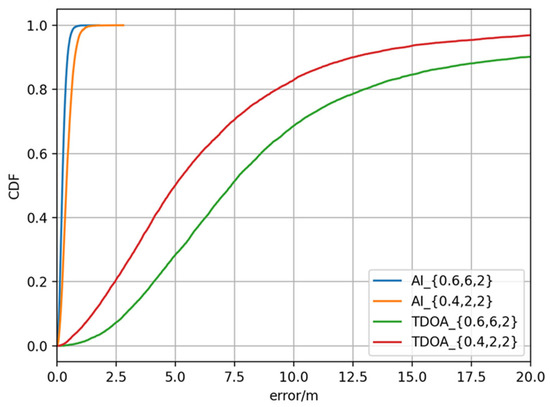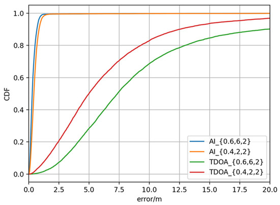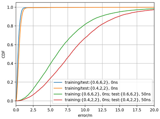 In this case, the data set for training is constructed by mixing data samples with different synchronization error settings. In the evaluation, standard deviations of 50 ns, 40 ns, 30 ns, and 0 ns are used for the training data set generation. Figure 18 and Figure 19 show the performance for direct AI-based positioning and AI-based ToA prediction when the test data set is generated by using a 50 ns standard deviation. According to the simulation results, it is observed that, compared with training manner 1, using mixed network synchronization error setting could improve the positioning performance. Yet, on the other hand, the improvement is not so significant. For clutter parameter {40%, 2 m, 2 m}, the positioning error @90% is around 3 m for both direct AI-based positioning and AI-based ToA prediction, which is a little far from the requirement in the IIoT scenario.