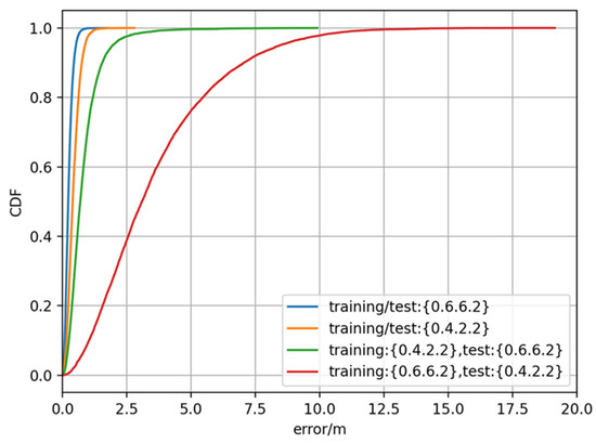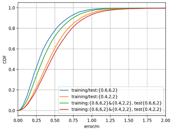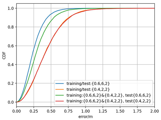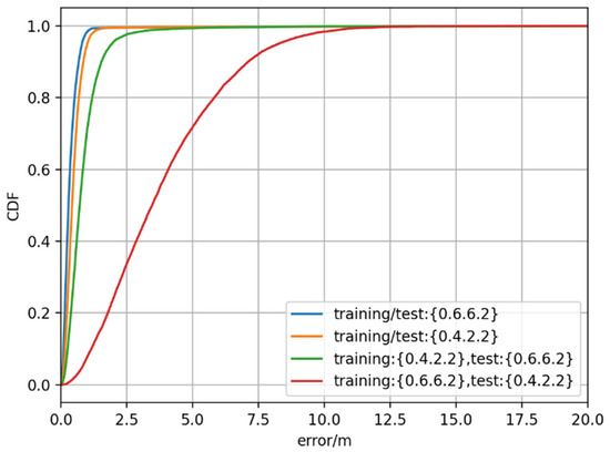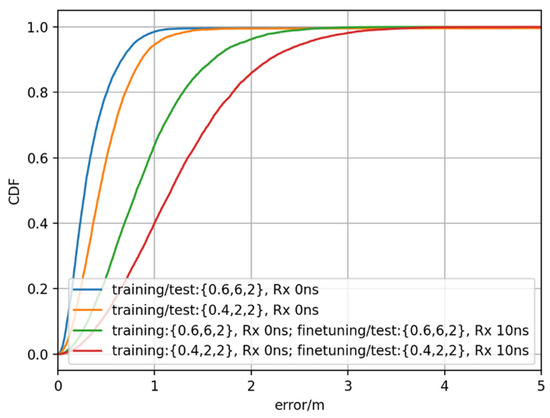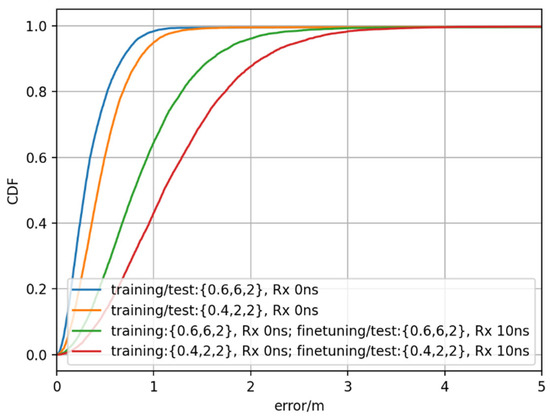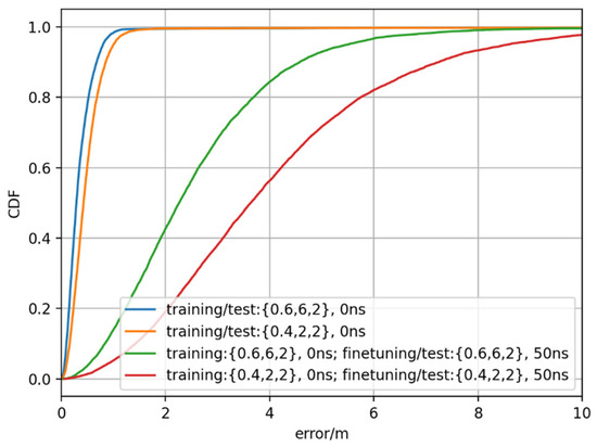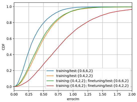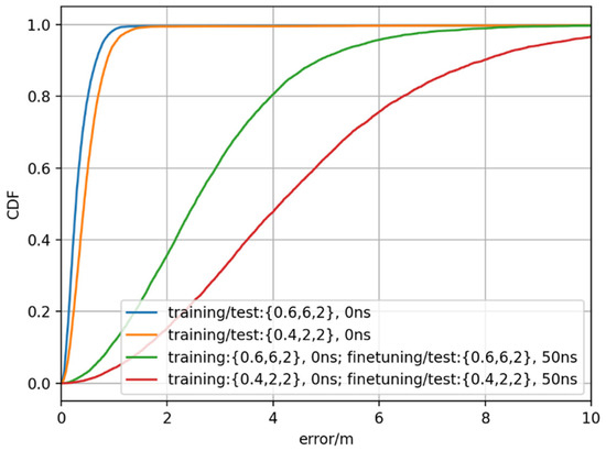 Figure 14 and Figure 15 summarize the results for fine-tuning. Compared with results without fine-tuning in Figure 10 and Figure 11, the positioning accuracy is improved reasonably. For example, for the AI model trained by clutter parameter {60%, 6 m, 2 m} and fine-tuned by data set with clutter parameter {40%, 2 m, 2 m}, when applying this model in the scenario with clutter parameter of {40%, 2 m, 2 m}, the positioning error is reduced from to around 7 m to around 1.5 m in both direct AI-based positioning method and AI-based ToA prediction method. However, compared with the results of the AI model trained with mixed data set in Figure 12 and Figure 13, there is still some gap. The possible reason is fewer samples from the applied scenario for fine-tuning.
