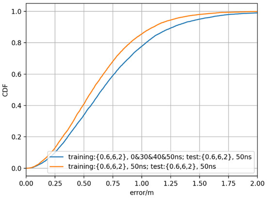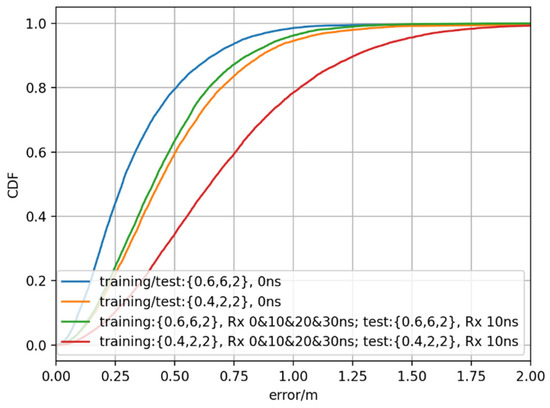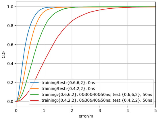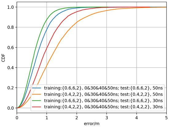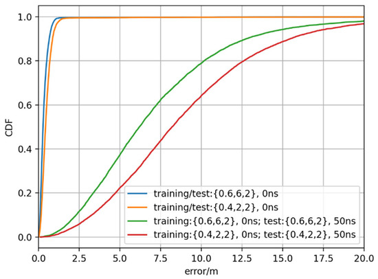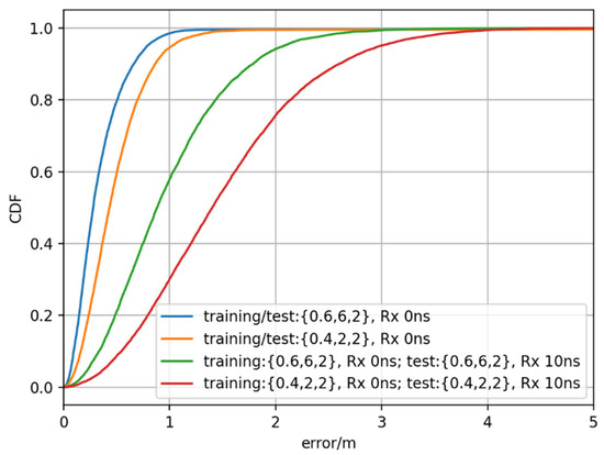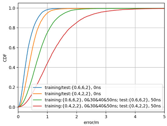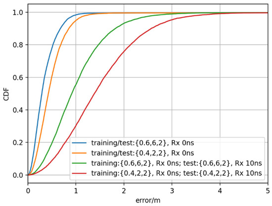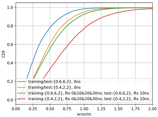 In this case, the data set for training is constructed by mixing data samples with different receiving timing error settings. In the evaluation, standard deviations of 10 ns, 20 ns, 30 ns, and 0 ns are used for the training data set generation. Figure 24 and Figure 25 show the performance for direct AI-based positioning and AI-based ToA prediction when the test data set is generated by using 10 ns standard deviations. According to the simulation results, it is observed that, compared with training manner 1, using mixed receiving timing error setting could improve the positioning performance greatly.