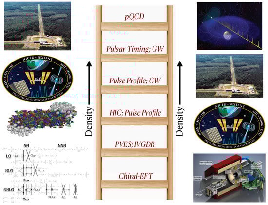 Powerful insights into the structure, dynamics, and composition of neutron stars have emerged during the last few years from discoveries that probe different regions of the stellar interior. Given the confluence of such discoveries, it is fitting to introduce an “equation of state density ladder” [3], akin to the cosmic distance ladder used in cosmology, to illustrate the different techniques that are being used to probe the various regions of the neutron star. In this manner, each rung in the ladder represents a theoretical, experimental, or observational technique that determines the equation of state (EOS) in a suitable density regime. Paraphrasing from the cosmic distance ladder, no one method can determine the EOS over the entire density domain existent in a neutron star. Rather, each rung on the ladder informs the EOS of a density regime that can be connected to its neighboring rungs. Such a density ladder has been constructed in Figure 1 using a variety of theoretical, experimental, and observational methods that have propelled the field to a golden era of neutron stars [4,5]. In the next few sections, we will describe the remarkable progress made in these various arenas and examine their profound implication in constraining the equation of the state of dense matter.
