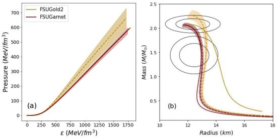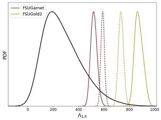 Besides constraints from EFT that, as we just saw, have a strong impact on the refinement of the functionals, especially in the case of FSUGold2, our previous work also incorporated astrophysical constraints on the EOS of neutron star matter from the tidal deformability of GW170817 extracted by the LIGO-Virgo collaboration [35], stellar masses and radii of two sources obtained by the NICER mission [48,49,50,51], and lower limits on the maximum mass of a neutron star obtained from long-time pulsar timing observations [52,53]. Indeed, all this information—together with constraints on the EOS of pure neutron matter predicted by EFT—was included in the model refinement [59]. By including all this new information in a Bayesian inference approach, posterior distribution functions were obtained for the neutron star matter EOS, the resulting mass-radius relation, and the tidal deformability of a neutron star.
