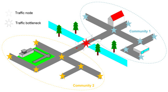 With this definition, now we consider the connection between Ollivier–Ricci curvature and the local topological characteristics of road networks. Suppose node i and node j are two nodes in a road network; if node i and node j are in different communities, then their neighborhoods have few overlapping nodes, and the transport from m i , the neighborhood of node i, to m j , the neighborhood of node j, is more dependent on the path i j . As W 1 m i , m j > d i , j , the curvature of i j is negative. If node i and node j are in the same community, then their neighborhoods have many overlapping nodes, and then the transport from m i to m j is less dependent on the path i j and can be finished via multiple paths between neighbor nodes. As W 1 m i , m j < d i , j , the curvature of edge i j is now positive.