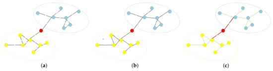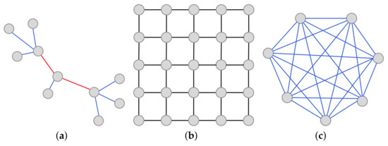 Figure 4. Illustration of the Ollivier–Ricci curvature of edges on a graph. The weights of edges in (ac) are 1. (a) Graph with tree structure, edges connecting each subtree (marked in red) have negative curvature; (b) infinite uniform grid graph, all edges have zero curvature; (c) complete graph, all edges have positive curvature.