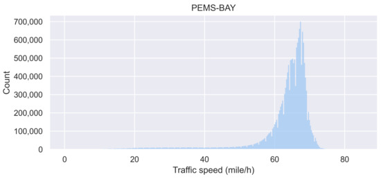 • PEMS–BAY. PEMS–BAY dataset is a traffic speed dataset collected by California Transportation Agencies (CalTrans), containing the traffic speed data from 1 January 2017 to 30 June 2017, collected from 325 sensors. The data distribution is shown in Figure 5.