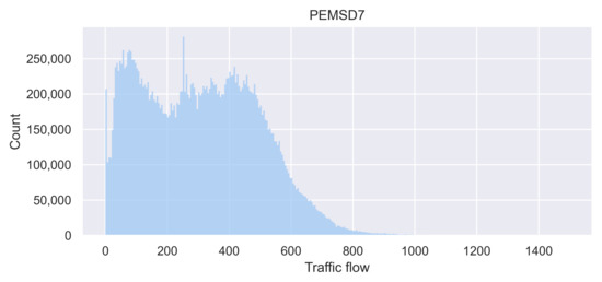 • PEMSD7. PEMSD7 dataset contains traffic flow data collected by 883 sensors in District 7 of California from 1 July 2016 to 31 August 2016. The data distribution is shown in Figure 6.