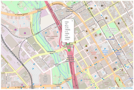 Taking STGCN+ as an example, the relationship between the average curvature of the connected edges of a node κ and the MAE improvement of the model with curvature information is shown in Figure 8. From the figure, it can be found that the κ values in the upper left part of the figure are all negative and have large absolute values, indicating that the corresponding connected edges of these nodes are most likely to be the bottlenecks in the road network. Figure 9 shows two nodes that lie in this category. The pair of nodes are located at intersections, which play an important role in the connectivity of the road network system, and removing the negative curvature edges connected to them is likely to disconnect the road network [27,41]. The addition of the curvature information that represents the bottleneck degree can improve the accuracy of the prediction results of this part of the nodes, and in this part, the larger the absolute value of κ , the more the improvement of MAE. Overall, the curvature graph convolution module can improve the prediction performance of the spatiotemporal graph neural network when evaluated at the scale of the whole road network, and the improvement is especially significant for nodes connected with more bottleneck edges.