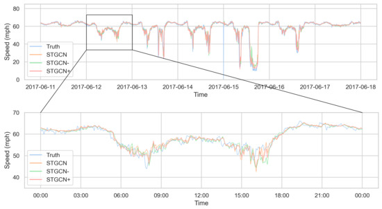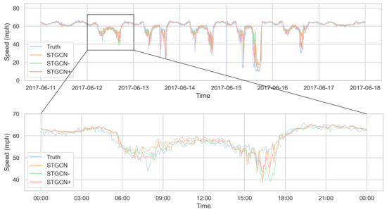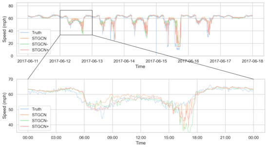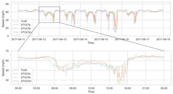 To intuitively compare the prediction performance of each model, the prediction results of STGCN-, STGCN, and STGCN+ with different prediction horizons on the PEMS-BAY dataset are visualized in this paper, as shown in Figure 10, Figure 11, Figure 12 and Figure 13. It can be observed that all three models obtain prediction results that align with the actual trends because the models themselves have a strong ability to learn the temporal dependence. In addition, the prediction performance of the three models gradually deteriorates as the prediction horizon increases, which is limited by the structure of the models themselves.