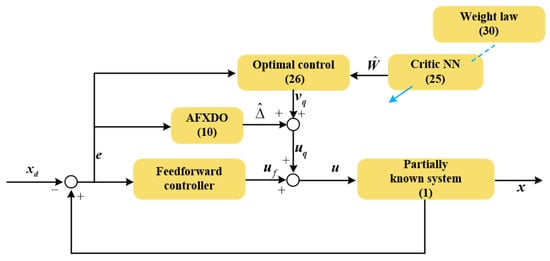 In this section, the optimal tracking control based on AFXDO is developed to fulfill the specified goals in the above section. For the controller , the novel fixed-time observer is ingeniously investigated to estimate the synthesized unknown term with adaptive observer gains. By virtue of the designed observer, the optimal control is derived with a critic-only ADP scheme, where an improved adaptive law with a variable learning rate is established for weight update. The flowchart of the proposed controller can be described in Figure 1.