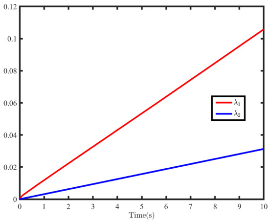 Contrary to most ADP schemes, where the Hamiltonian function is structured for the nominal system, the HJB equation is conducted related to (13), consisting of the estimation error, which leads to challenges for adjusting the optimal control policy and weight update. As opposed to the existing control within the ADP framework, where the weight update is carried out by minimizing the Bellman error with gradient descent [39,40], by imposing an auxiliary operation on intermediate parameters and employing the Gaussian function to tune the learning rate, the adaptive rule (30), which contains the weight errors, can compel the approximation of weight converge to an ideal weight. In particular, when the tracking error is far from the origin, is decreased to avoid the initial oscillation of weight, which further affects the control input. If the tracking error is close to zero, larger can enable online learning ability with an acceleration convergence of weight, and the PE condition can be easily verified by transferring it into the positive-definite property of matrix , avoiding introducing the concurrent learning or the experience replay employed in most ADP frameworks.