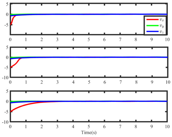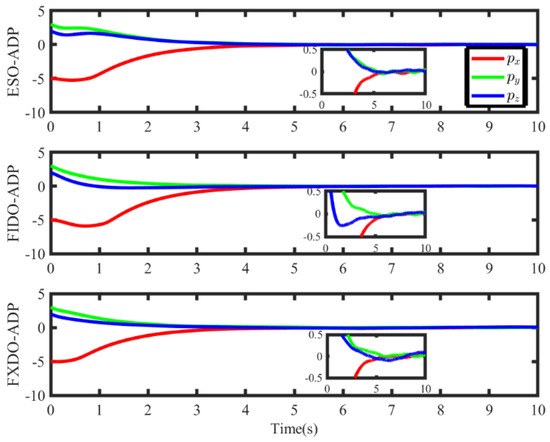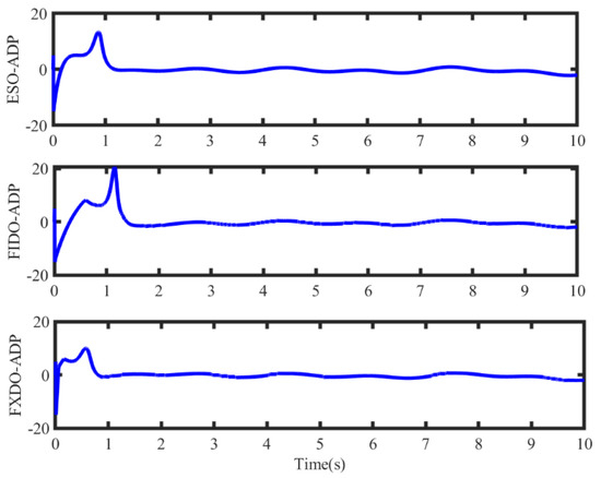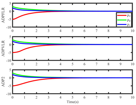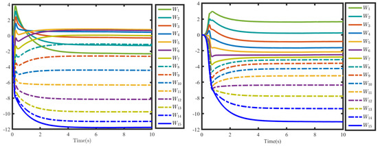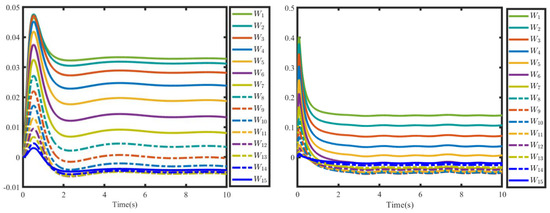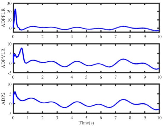 Figure 10 and Figure 11 show the weight of the NN under the three controllers. The weights of the actor NN and critic NN in ADP2 are described in Figure 10, where the weight estimation of the critic NN and actor NN have obvious chattering at the initial stage. Conversely, the weight of the critic NN converges to an ideal weight based on critic-only ADP, as shown in Figure 11. Under the critic-only ADP framework, the weight update law of critic NN extracts the weight error through the auxiliary filtering operation, such that the weight update is driven by the weight error implied in the updated law, resulting in the fast convergence of weight. Furthermore, Figure 11 compares the weight of ADPFLR and ADPVLR. As shown in Figure 11, the ADPVLR significantly reduces the chattering occurring at the initial stage of ADPFLR with a fixed learning rate, which indicates that the proposed variable learning rate is superior to the weight update with a fixed learning rate. Specifically, its key features can be described thus: when the tracking error is large, the learning rate is reduced to avoid chattering; when the tracking error is small, the learning rate is increased to accelerate the convergence rate.