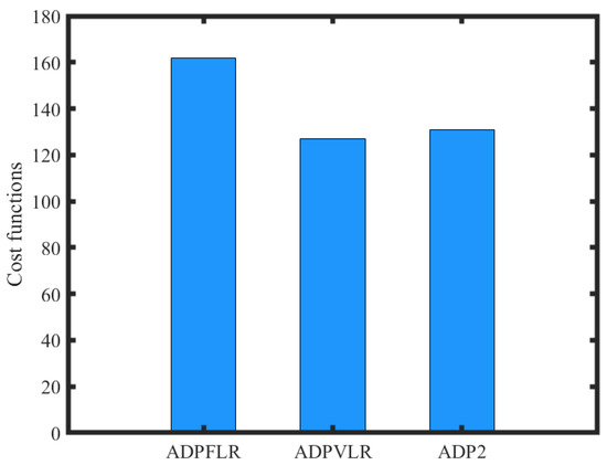 Since the convergence of weight affects the optimal control, the control inputs of three controllers in the channel are shown in Figure 12. Compared with ADPFLR and ADPVLR, the control input of ADPVLR is smaller, which can be due to the weight of the variable learning rate when avoiding the initial large control input. In addition, the control input of ADP2 is small, which leads to the slow convergence of tracking errors. Considering both tracking errors and control consumption, the cost functions of the three controllers are shown in Figure 13, where ADPFLR with a fixed learning rate requires high control consumption to achieve fast tracking performance. By the weight update law (30), the cost function of ADPVLR is decreased by 19.13% from that of ADPFLR. By introducing the weight updating law of variable learning rate, ADPVLR has a tradeoff ability in control consumption and tracking performance, which not only achieves better tracking performance but also ensures lower control consumption.