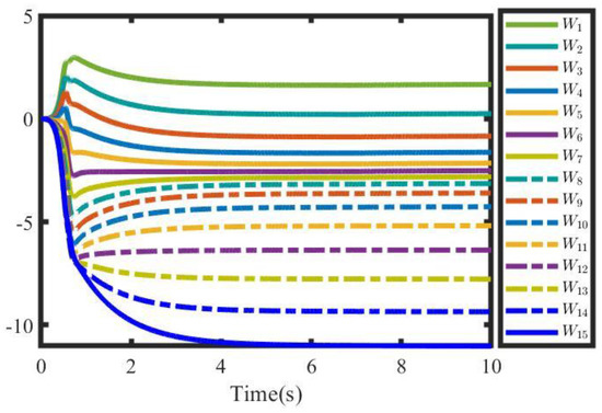 Different from the uncertainty of the above system, , we set the only to unknown for a sensitive analysis of the system. The tracking performance of position and velocity are shown in Figure 14 and Figure 15. The position and velocity can follow the reference position and velocity in 4 s. The weight of the critic NN is described in Figure 16, avoiding the initial chattering phenomenon. We will validate the effectiveness of the completely unknown system in actual application.