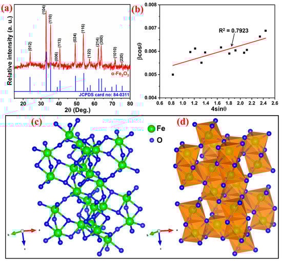 (a) Powder XRD pattern of the synthesized α-Fe2O3 NPs. The Rhombohedral crystal structure of α-Fe2O3 drawn by Vesta software (Version 3.4.5). (b) Williamson–Hall (W-H) plot for α-Fe2O3 NPs. (c) Ball-and-stick model of α-Fe2O3 crystal structure and (d) polyhedral model of α-Fe2O3 crystal structure. Unit cell lattice parameters: crystal system—Rhombohedral, space group—R-3c, distances a = b = 5.10485, c = 13.91330, along with axes (for Fe, x = 0.000000, y = 0.000000, and z = 0.145825 and O, x = 0.000000, y = 0.304877, and z = 0.750000), and angles α = β = 90°, γ = 120°.