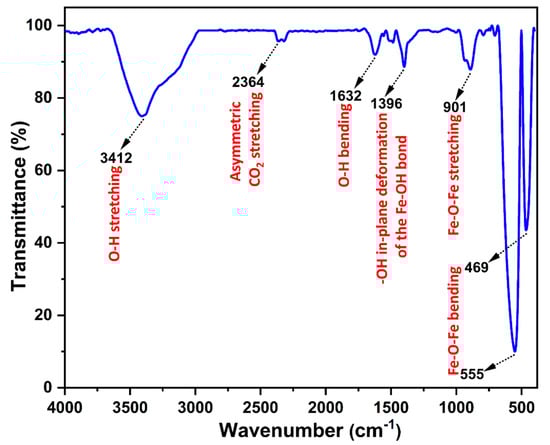 FT-IR analysis was used to understand the chemical structure of the sample as shown in Figure 2. The weak peak that appeared at 2364 cm−1 can be attributed to the CO2 asymmetric stretching vibration present in the atmosphere. The band at 1396 cm−1 can be attributed to the -OH in-plane deformation of the Fe-OH bond. The band at 901 cm−1 corresponds to the stretching vibration of the Fe-O-Fe bond [31,32]. The bands at 555 and 469 cm−1 can be assigned to the Fe-O-Fe bending vibration of α-Fe2O3 NPs [33].