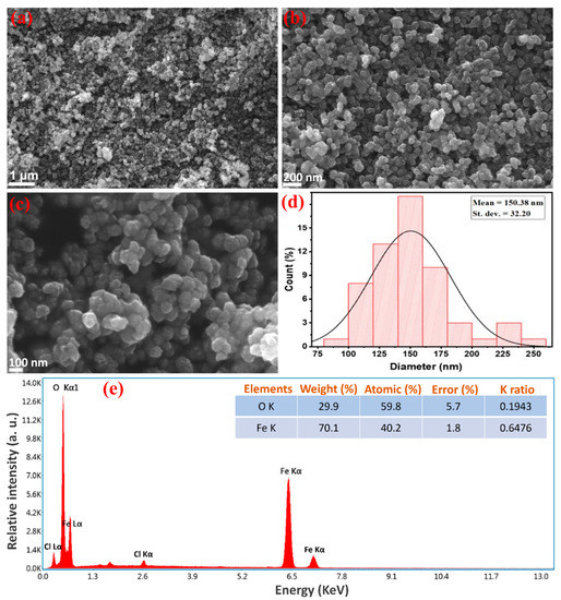 SEM and EDX were performed to evaluate the morphology and chemical composition of the α-Fe2O3 NPs. Figure 3a–c shows the SEM micrographs of the α-Fe2O3 NPs. Figure 3a shows the presence of fine grains (b and c) with a spherical shape, with some agglomeration. The average particle size (diameter) was found to be around 150 nm, using ImageJ software (Figure 3d). Figure 3e shows the EDX spectrum of α-Fe2O3 NPs, which detected the peaks of Fe and O, resulting in α-Fe2O3 NPs with high purity. The EDS images of the α-Fe2O3 NPs are shown in Figure 4. The figure shows that Fe and O are evenly distributed, confirming the homogeneity of the sample. Additional peaks for Cl were found in the EDX spectra due to the presence of impurities in the Fe (NO3)3·9H2O starting material. Furthermore, the Fe:O atomic ratio of α-Fe2O3 NPs, obtained from the SEM-EDS analysis, is estimated to be approximately 2:3, which is very closely consistent with the theoretical weight ratio (2:3) of Fe2O3.