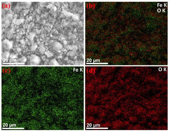 (a) EDS mapping of the prepared α-Fe2O3 NPs, (b) overall elements distribution, (c) Fe distribution, and (d) O distribution.