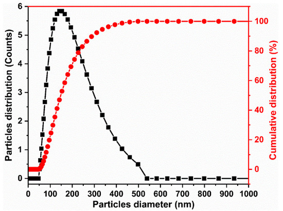 The hydrodynamic particle size distribution of the α-Fe2O3 NPs was estimated using dynamic light scattering (DLS). Figure 5 shows the DLS size distribution plot of the α-Fe2O3 NPs dispersed in DW. According to the histogram, the average hydrodynamic particle size was found to be 141 nm.