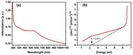 UV–Vis spectroscopy was performed to evaluate the absorbance and bandgap of the α-Fe2O3 NPs, as shown in Figure 6a,b. The maximum absorption was observed at 560 nm. Based on these results, α-Fe2O3 NPs can be used in photocatalytic MB dye degradation that requires visible-light absorption. The band gap energy was calculated by extrapolating the line from the from versus , as shown in Figure 6b. The band gap was calculated to be 2.25 eV, which is in good agreement with an earlier report [34].