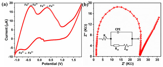 (a) Cyclic voltammetry and (b) Nyquist plot of the synthesized α-Fe2O3 NPs.