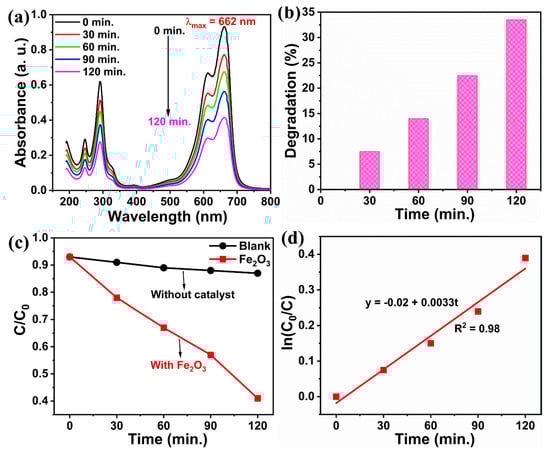 The photocatalytic activity of the α-Fe2O3 NPs for the degradation of the methylene blue dye under sunlight irradiation was evaluated. The degradation of the MB dye irradiated by natural sunlight was observed every 30 min. The intensity of the peak at 662 nm decreased in the presence of the catalyst, complete degradation was observed at 120 min, and the photocatalytic activity is shown in Figure 8a. The photodegradation efficiency of the α-Fe2O3 NPs, as shown in Figure 8b, indicates that 33% of the dye decomposed after 2 h of irradiation. The rate of degradation of MB dye without the catalyst (blank test) and with catalyst is shown in Figure 8c; the photodegradation reaction data can be described well by pseudo-first-order reaction kinetics, given by Equation (4), as shown in Figure 8d.
