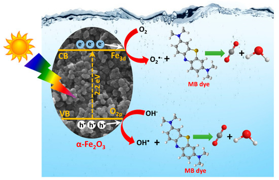 When α-Fe2O3 absorbs sunlight equal to or greater than the bandgap energy, electrons in the valence band are excited to the conduction band, resulting in the generation of holes in the valence band and electrons in the conduction band. Oxygen and water molecules were adsorbed onto the surface of the α-Fe2O3 catalyst. Positive holes in the valence band oxidize OH- or water at the catalyst surface to produce •OH radicals, which are extremely strong oxidants (the oxidation potential of the •OH radical is 2.80 V). The hydroxyl radicals subsequently oxidize the MB dye and produce CO2 and H2O (Figure 9) [36,37,38]. The electrons on the catalyst surface are rapidly captured by molecular oxygen adsorbed on the catalyst surface and are reduced to form superoxide radical anions (O2•−; the oxidation potential of the superoxide radical anion is −2.4 V). Superoxide radicals react with the MB dye to produce CO2 and H2O, as shown in Equations (5)–(8), respectively.