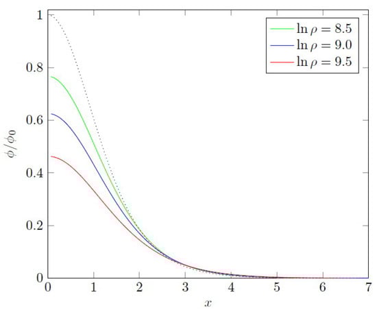 Profile of scalar field (solid lines) as function of dimensionless variable x in comparison with approximation (25) (black dotted line) for some central densities. Parameter cm; means . For the exact solution, the scalar field starts from smaller values ().