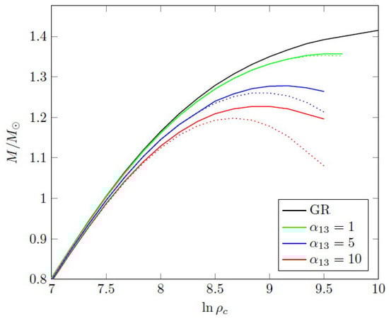 Mass–density relation in gravity for some in comparison with GR. The dotted lines correspond to results obtained with simple approximations of the scalar field; means that the value of is given in units of cm.