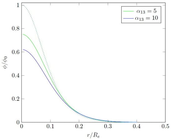 Realistic solutions of Equation (38) for a chosen posses the same property as the solution of the Lane–Emden equation in Newtonian gravity: for some , the function vanishes. This corresponds to the surface of the white dwarf. In the Jordan frame, because scalar field is zero on the star’s surface, and therefore, . Because the first derivative of the scalar field also vanishes on the surface, the gravitational mass of a white dwarf is