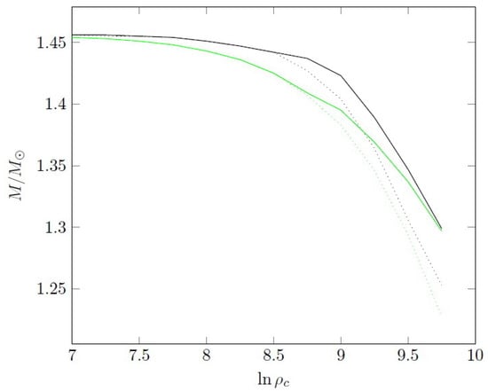 Calculations for some show the same pattern as for : the star mass decreases with increasing central density. Some results are given in Figure 4. For , the perturbative solution is not valid. Obviously, for a realistic Chandrasekhar EoS, we obtain that the stellar mass has a maximum for a certain density.