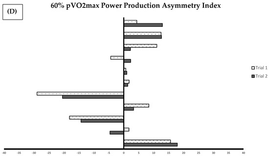 Power production AI results and reliability data are reported in Table 1. Power production AI data were normally distributed. Individual asymmetry index values are illustrated in Figure 1. ICC results were interpreted as having excellent reliability in the power production AI at 60%, 70%, 80%, and 90% of pVO2max. The two-way repeated measures ANOVA revealed no significant intensity–visit interactions for the power production AI (f = 0.835, p = 0.485, η2 = 0.077), with no significant main effects present for intensity (f = 0.270, p = 0.847, η2 = 0.026) or Visit (f = 0.011, p = 0.919, η2 = 0.001).