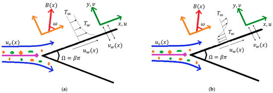Geometrical representation of flow model for (a) stretching wedge and (b) shrinking wedge with suction/injection (), temperature of the flow (), magnetic field , angle of inclined for magnetic field , and angle between two surfaces .