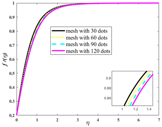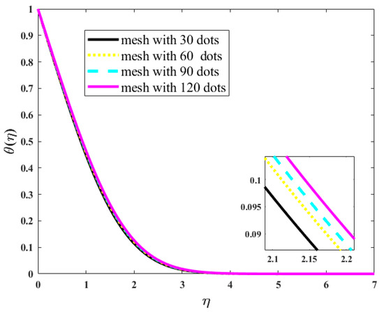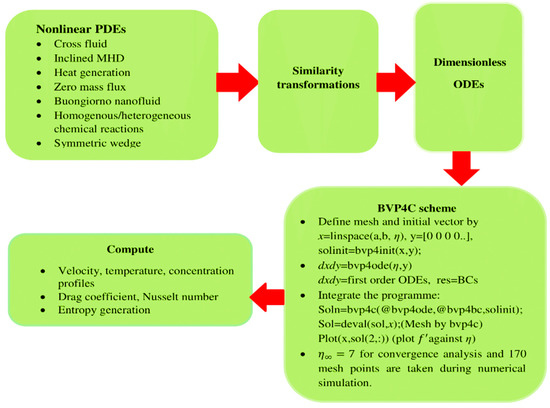 The back of bvp4c is the R-K45 numerical method which is the most convergent for solving the first-order linear/nonlinear ODEs. This method is also known as the collection procedure of order four. This numerical strategy must choose the finite and approximate value of , in this case, . The convergence criterion has been achieved in the case of for the case of momentum, temperature, and concentration equations with the crude mesh of 120 points taken during the numerical simulation of the problem. The MATLAB programming procedure is also given here. Figure 2 is designed to represent the mechanism of the bvp4c scheme.