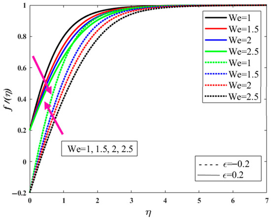 After utilizing similarity transformations, Equation (4), referred to as the momentum equation, is transformed into Equation (10). The energy equation (5) is transformed into the ODE mentioned in Equation (11), and the homogeneous/heterogeneous modeled PDEs (6) and (7) are transformed into the ODEs mentioned in Equations (12) and (13) after utilizing similarity transformations. Here and reflect extensible as well as contractable wedge cases. Sundry parameters are the magnetic effect ; the Weissenberg number (local) is ; the intake/outtake effect is ; and is the diffusion coefficient. Further, the Brownian motion parameter is ; the thermophoresis parameter is ; the heat generation parameter is ; the Schmidt number ; and is the homogeneous reaction with a coefficient rate . The term is the ratio of species diffusivity. The final form of the Weissenberg number obtained by taking is .
