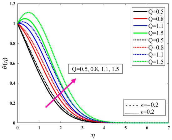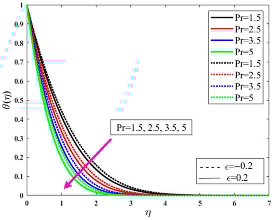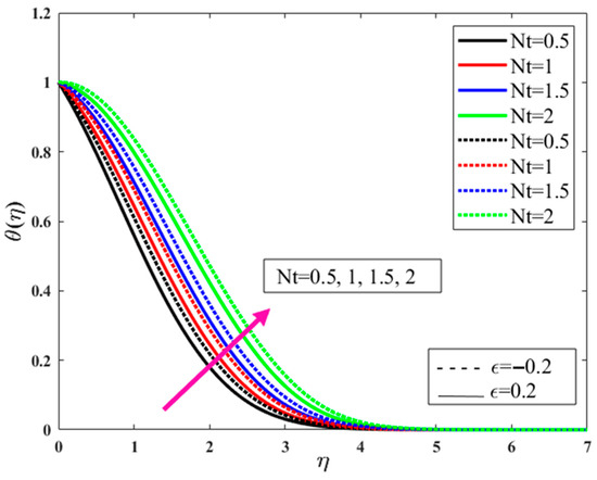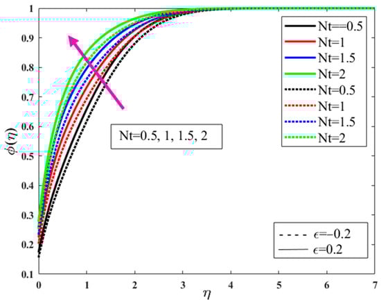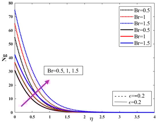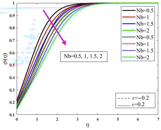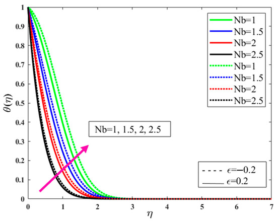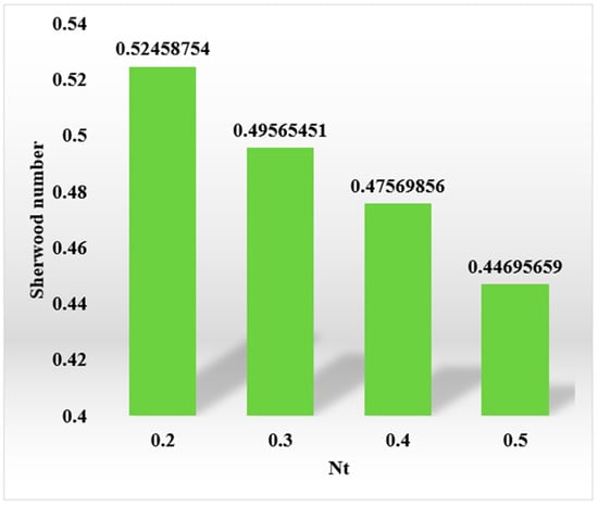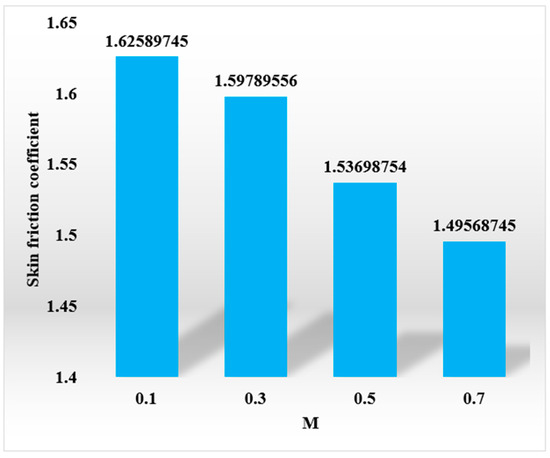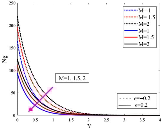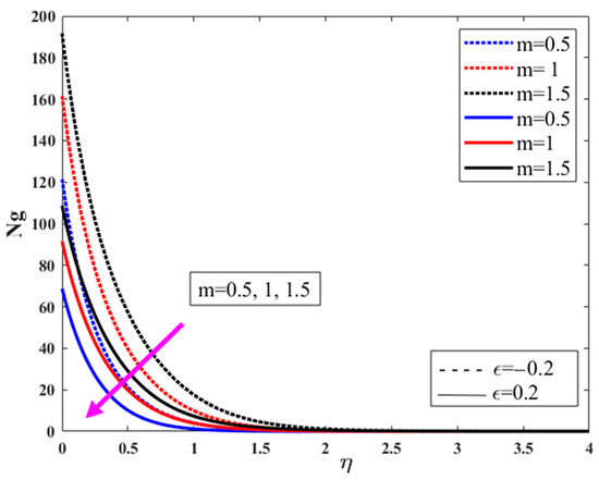 Equation (3) is automatically satisfied as equal to zero by utilizing the similarity transformation. Equation (4) comprises the inclined magnetic field which produces a Lorentz force that provides resistance to the fluid flow, i.e., the Falkner–Skan wedge term, a Cross fluid in which indicates a material constant and represents the viscosity index. The terms on the right-hand side of Equation (5) indicate thermal diffusivity, a Buongiorno nanofluid having the combination of Brownian diffusion and thermophoresis parameter ; species diffusivity of chemical species a is represented by ; and depicts heat generation. In Equations (6) and (7), the first terms on the right-hand side indicate the diffusion equations of the chemical species. Velocity components ; density of based fluid; electric conductance ; kinematic viscosity ; the relaxing time is ; the consistency factor ; heat capacitance; ratio of heating capacitance (effective) of nanomolecules and a conventional liquid; the Brownian coefficient and diffusion of thermophoresis/species . Mass flux time-dependent velocity takes the form , and heat generating/absorption takes the form of . is a constant coefficient of energy generation/absorption; is volume thermal expansion.