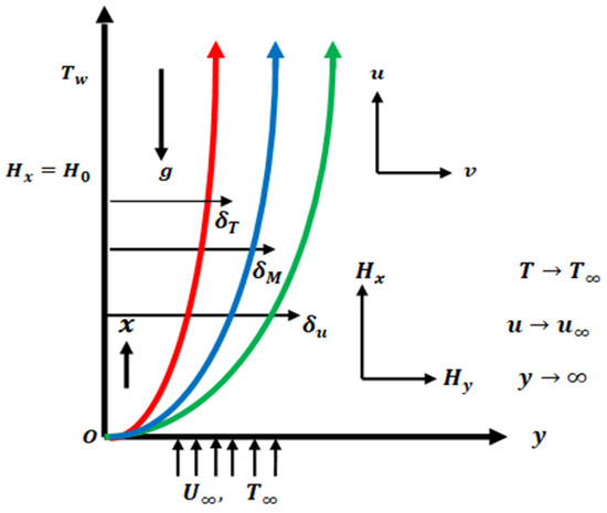 The terminologies and denotemagnetic and fluid velocity vectors, respectively, in the and directions in Figure 1, in which and are parallel and normal to the vertical plate. This is done by considering electrically conducting fluid that is steady and inviscidin two components. The thermal diffusivity of the fluids is denoted by , represents the magnetic intensity, the temperature is denoted by , the free stream temperature is denoted by , represents the heat capacity, and refer to the magnetization at the surface. The density of the fluid is denoted by , the magnetic moment is represented by , the kinetic viscosity of the fluid is denoted by , the volumetric temperature coefficient is represented , and the gravitational acceleration is denoted by . These are examples of how inclined electromagnetic field, heat, momentum, and continuity are expressed mathematically by the following [11,12]: