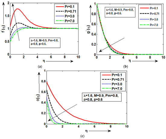 The significance of the Prandtl number is shown in Figure 2a–c for distinct values of Pr = 0.1, 0.71, 3.0, and 7.0 along the heated and magnetized plate. By maintaining some constant variables, the fluid temperature, magnetic field, and velocity are acquired in order to examine the behavior of physical attributes. In Figure 2a, it is shown that the velocity improves when Pr is less than 0.1, but falls when Pr is more than 7.0. It should be observed that the desirable variations are obtained at each Pr value and then approach the specified boundary condition asymptotically. The electromagnetic effects in the fluid in Figure 2b are at their peak at a smaller Pr = 0.1, while minor quantities are seen at larger Pr = 7.0. The fluid’s magnetic profile showed good changes at each Pr value. The temperature distribution is maximal for a small value of Pr = 0.1, but is investigated at a bigger Pr =7.0 in a noticeable way, according to Figure 2c. The presence of = 1.6 causes the temperature changes to be very noticeable along with noticeable slip effects. The above reaction was anticipated since a rise in Pr is associated with higher temperature-dependent density variation, which enhances the buoyant force. When Pr grows, the thickness of the thermodynamic boundary layer diminishes. At each amount of Pr, the temperature plot demonstrates significant temperature slip with significant variance. The velocity field, magnetic plot, and temperature distribution for different quantities of = 0.1, 0.7, 1.5, and 2.5 along the surface of heated and magnetically chargedsurfacesare shown in Figure 3a–c.