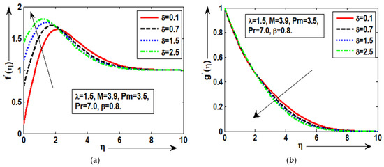Using an adequate stream function approach, the associated mathematically dynamic PDEs system is changed into a similar ODEs framework having similarity elements. Equations (9)–(11) use the progressive Keller Box procedure to solve a related associated ODE system with provided boundary conditions (12). By employing expression (13), the newly established elements are provided by and ,