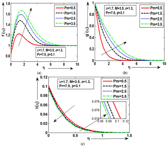The velocity graph in Figure 3a reaches its highest value at a large value of = 2.5 and its minimum value at a small value of = 0.1 with noticeable slip, and it then approaches its supplied condition asymptotically. With good variations, it can be shown in Figure 3b that the magnetic profile improves at small values of = 0.1 and is minimal at large values of = 2.5. Figure 3c shows that, with better thermal slip, the temperature profile improves at lower values of = 0.1 but declines at higher values of = 2.5. The solutions are significantly affected by the magnetic parameter. It is evident that magnetization increases fluid restriction, restricting the fluid’s movement. The magnetization actually works against the transport processes. This happens due to the impact of the electromagnetic field’s Lorentz force, which grows with rising Pm and creates additional restriction of the transport mechanisms. In Figure 4a, when = 1.7, = 3.5, and = 1.3 are present along a polarized and heatingsurface, the highest velocity slip is obtained at bigger Pm = 3.5, and the minimum velocity slip is obtained at reduced Pm = 0.5. For each value of Pm, the magnetic plot in Figure 4b shows the major changes. Figure 4c shows the temperature response for each Pm to be similar. The velocity graph shows a good slip phenomenon that is both excellent and favorable. At each value of Pm, the flow velocity graph shows good changes, which then asymptotically approach the specified boundary condition. The viscosity of the fluid increases and the fluid thickens more as the electromagnetic Prandtl number grows; as a result, the thickness of the boundary layer diminishes. The electromagnetic Prandtl value, which measures the ratio of magnetic to kinetic energy, reveals that this conclusion was anticipated. The magnetic energy is thus enhanced while the kinetic energy is decreased by reducing the electromagnetic Prandtl value Pm.