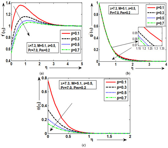 As seen in Figure 6a, the velocity is at its highest with a fair slip response at a mixed convection parameter value of = 2.5, but the quantity of is at its lowest at = 0.5. Additionally, it should be mentioned that the profile exhibits good behavior for surfaces of geometrical shape when mixed convection is present. The magnetic field profile in Figure 6b demonstrated good variances for each value of along the electromagnetic geometry and asymptotically achieves the specified boundary conditions. The Prandtl number indicates the connection between thermal and momentum diffusivity. Heat will escape from the surface more quickly from fluids with smaller Prandtl coefficients due to their greater thermal conductivity. By leaving the remaining parameters = 1.1, = 0.6, and = 1.5 in constant form, it can be determined from Figure 6c that the surface temperature along the field of the provided shape is maximal at the minimal value of = 0.5 and minimum at the larger value of = 2.5. At each value of, the temperature graph shows a good variety. Physically, it was anticipated since bigger values of related to higher forced convection, which improves the fluid flow’s acceleration. The magnetic effects are significantly detected exactly at the surface because of conducting processes, but they are zero for all values below the surface.