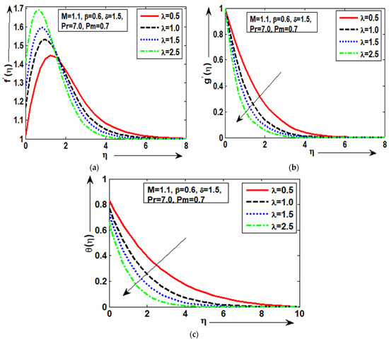 Figure 5a–c illustrates the impact of the thermal slip parameter along a magnetically vertical surface at distinct values of = 0.1, 0.7, 1.5, and 2.5. In Figure 5a, it can be observed that velocity increases at lesser concentrations of a = 0.1 while it declines at higher quantities of a = 0.7. Additionally, it needs to be highlighted that in the presence of thermal slip, the velocity profile exhibits good slip effects along the vertical surface. In Figure 5b, the magneto profile rises when the thermal slip parameter is reduced ( = 0.1), but when it is larger ( = 0.7), a lower magnetic profile is achieved by maintaining some other factors constant ( = 7.3, = 5.1, and = 0.5). The above outcome was anticipated since an enhancement in magnetic force enhances the Lorentz forces that resist flow patterns and slow down fluid motion. At any value of the thermal-slip number, the same outcome is achieved. According to Figure 5c, the thermal-slip effects on fluid temperature are at their peak when the quantity is smaller than = 0.1 and smaller than = 0.7. Additionally, it should be highlighted that the presented phenomena yield a temperature distribution with outstanding thermal slip that asymptotically achieves the specified boundary conditions. It was expected because magneto diffusion, which is essential for the aforementioned processes, is diminished by increasing magnetic-Prandtl quantity. For the magnetic surface, Figure 6a–c show a comparison of the various values of the mixed convection parameter = 0.5, 1.0, 1.5, and 2.5.