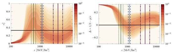 Probability density functions (PDFs) of the speed of sound (left panel) and trace anomalies (right panel) as functions of the energy density. Vertical lines represent the median and credibility region for the peak position in (green solid and dotted lines), values at the centre of maximally massive neutron stars (blue solid and dashed lines), and the peak position in (purple solid and dash-dotted lines). Horizontal, black lines show the conformal values of (left panel) and (right panel) [8].