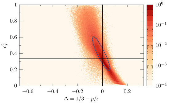 Probability density function (PDF) of the trace anomaly vs. the speed of sound at the centre of maximally stable neutron stars. The dotted blue ellipse marks the credibility around the mean. The black horizontal and vertical lines mark the conformal values [8].