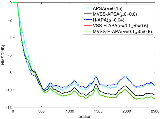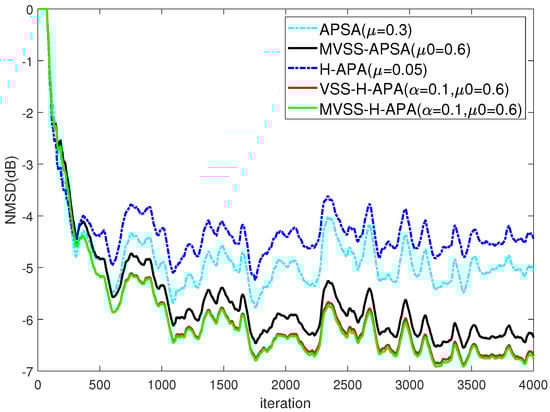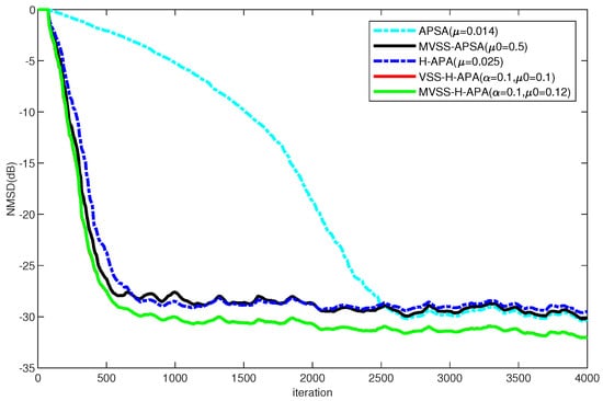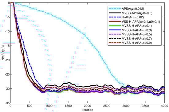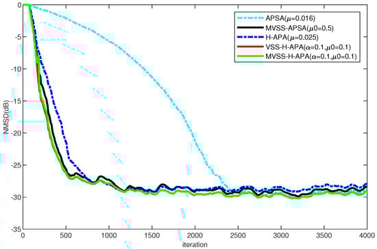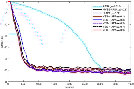 We conducted simulation tests of the proposed algorithm in an application environment of system identification. In all tests, we have set the values of M, K, and to be 10, 64, and 0.00001, respectively. In this system identification scenario, the vector to be identified is normally distributed with a mean of 0 and a variance of 1. The input signals are generated by passing a normal process with standard deviation equal to one through a filter with a first-order transfer function represented by . This filter attenuates the high-frequency components of the input signal and produces an output signal that depends on both the current and past values of the input signal. The output signal we want to obtain is being affected by unwanted noise, but we have specified that the ratio of the signal power to the noise power should be 30 decibels, which can help us quantify the level of noise present in the signal. (The signal-to-noise ratio here refers to the signal-to-noise ratio of the Gaussian white noise added to the output noise.) Moreover, the noise added to the desired output signal is impulsive and follows the -stable distribution. Because -stable distribution is a non-Gaussian noise model with heavy-tailed distribution, it can well simulate the collective attenuation characteristics of real noise [23]. Specifically, the noise signal is denoted as , and it follows the -stable distribution with parameters , , , and . Unless otherwise stated, we have fixed the parameters of the -stable distribution to be , for all subsequent tests. The parameters we selected are all parameters that make the distribution symmetric, i.e., . The parameters being referred to have the same definition as the ones that were defined by Shao and Nikias [3]. The paremeters and of MVSS-APSA is set to and in this paper, for the reason that and of that has better performance known through [18]. Based on the findings in [5], we set the mixing factor to 0 for the H-APA, as it has been shown to result in better performance at this value. The step sizes used by the relevant algorithms in all experiments are labeled in the legend, and these step sizes are specifically designed to ensure that they converge with the same steady-state accuracy. In other words, the step sizes have been carefully chosen to achieve a common level of accuracy and stability in the convergence of the algorithms. The tests’ outcomes are reported using the normalized mean-squared deviation (NMSD) metric, which is computed as follows: . The tests were repeated 1000 times to obtain an average result.