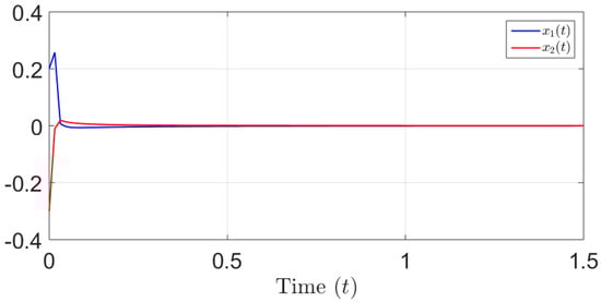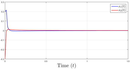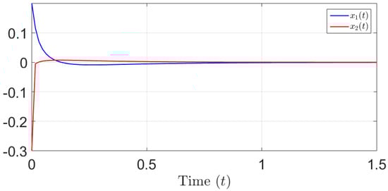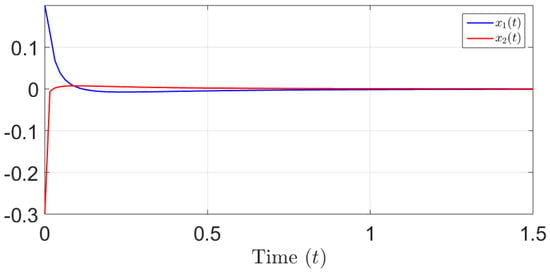 This section includes a simulation study featuring a numerical illustrative example, which aims to verify the effectiveness of the suggested method for stabilizing the proposed class of FONSs. The system presented in Equation (4) can be described as follows: