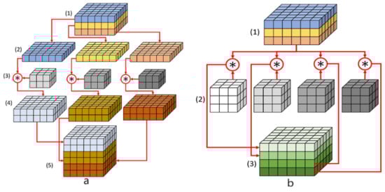 Illustration of the depth-wise and standard 2D convolution operations. (a) depth-wise 2D convolution: (1) input volume with shape 6 × 6 × 3, (2) channel separation, (3) channel filters with shape 3 × 3 × 2 (depth multiplier = 2), (4) output of the convolution operation for each input channel, (5) channel concatenation to get the final output with shape 6 × 6 × 6. (b) standard 2D convolution: (1) input same as (a), (2) four different convolution filters with shape 3 × 3 × 3, (3) convolution output with shape 6 × 6 × 4.