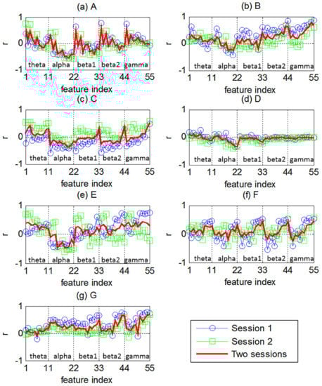 To verify the relationship between the MP state and EEG characteristics describing different frequency bands and discover the most significant EEG characteristics of MP changes, the linear correlation coefficient r between EEG power in 55 different frequency bands and the time history of the target MP type, and the correlation coefficient r in three different situations, Session 1 (Case 1), Session 2 (Case 2) and Double Session (Case 3), are repeatedly calculated, as shown in Figure 4.