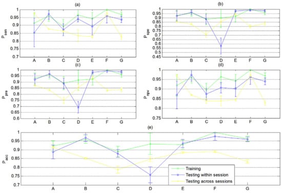 Error bar graph of CNN model for training intra-session testing and cross-session testing. (a–e) represent the performance of and , respectively.